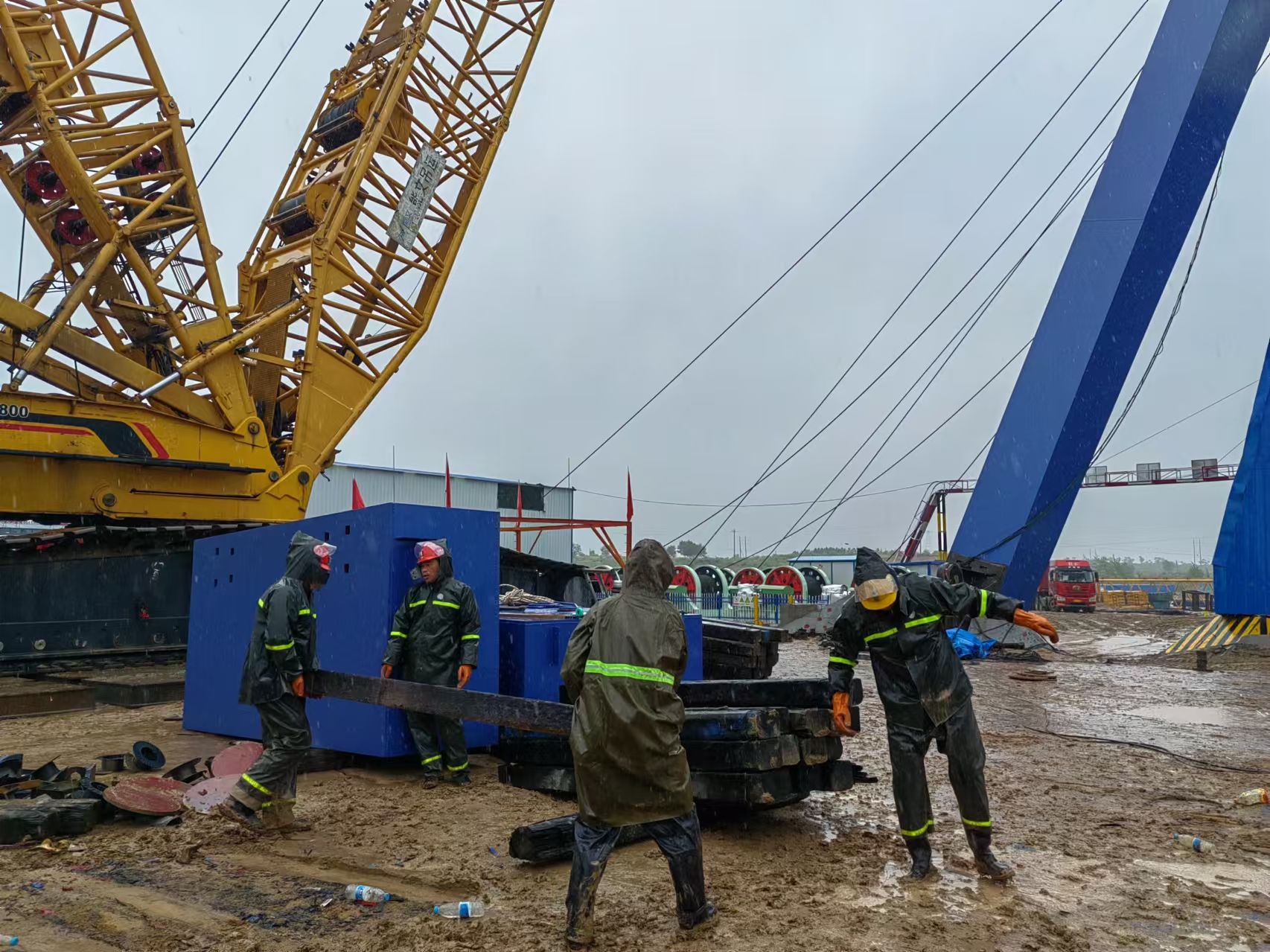八月以来,天气逐渐步入了多雨期,连日来的大雨为工程类项目的施工增加了额外的阻力,给现场的施工带来了诸多不便。海则滩副井安装工程正值抢工期、赶进度、抓主体建设的关键施工期,为全力加快推动项目建设,项目部全体职工无畏风雨奋战在项目施工最前线,全力以赴与不利天气作斗争,用责任与担当有条不紊推动副井井架安装工程顺利进行。